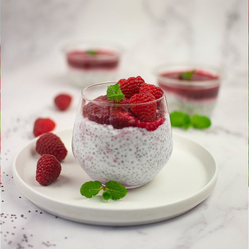 Składniki: Deser chia (Jogurt grecki (MLEKO PASTERYZOWANE, Żywe kultury bakterii jogurtowych), Jogurt naturalny (2% tł.) (MLEKO PASTERYZOWANE, Żywe kultury bakterii jogurtowych), Nasiona chia, Miód pszczeli, Cukier wanilinowy) (75%), Mus malinowy (Maliny, Woda, Miód pszczeli, Skrobia ziemniaczana) (25%)